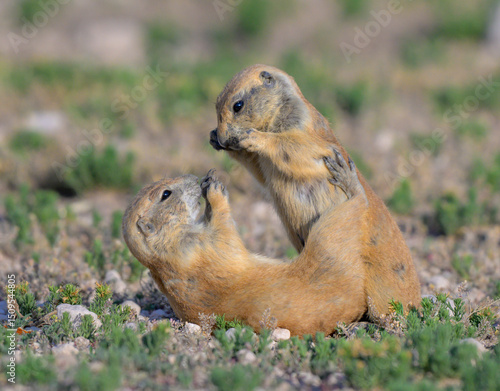 © Ivan Kuzmin, Naklejka premium Young black-tailed prairie dogs (Cynomys ludovicianus) playing, Lubbock, Texas, USA.