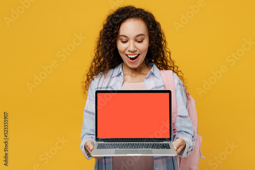 Naklejka premium Young black teen girl student she wear casual clothes backpack bag hold laptop pc computer blank screen workspace area isolated on plain yellow color background High school university college concept.