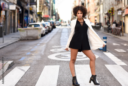 Fototapeta premium Young black woman with afro hairstyle standing in urban background
