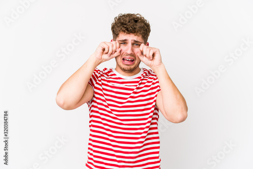 © Asier, Fototapeta premium Young blond curly hair caucasian man isolated crying, unhappy with something, agony and confusion concept.