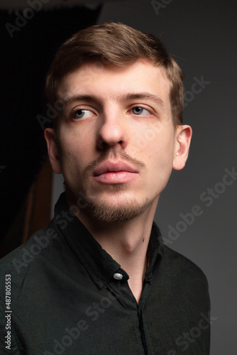 © PIXbank, Fototapeta premium Young blond european man with short beard and mustache isolated on dark grey portrait