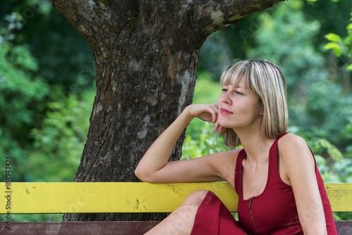 © Artenex, Naklejka premium Young blond woman in a red dress leaning sits on a wooden bench. .Businesswoman walking along the street and resting in the green city park on the beautiful sunny summer day.