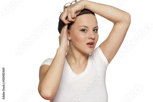 Fototapeta premium young blonde adjust net cap for a wig