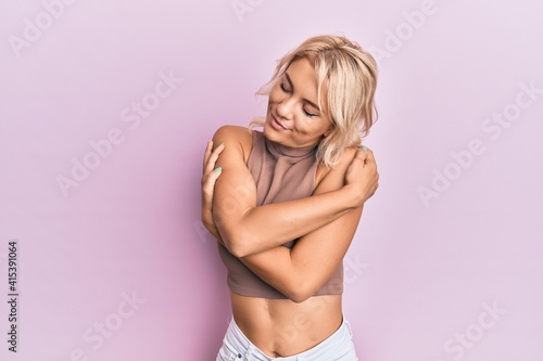 Obraz premium Young blonde girl wearing casual clothes hugging oneself happy and positive,...
