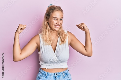 Obraz premium Young blonde girl wearing casual clothes showing arms muscles smiling proud....