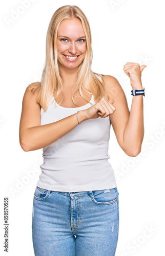 © Krakenimages.com, Obraz premium Young blonde girl wearing casual style with sleeveless shirt pointing to the back behind with hand and thumbs up, smiling confident