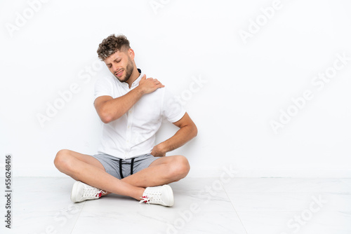 Fototapeta premium Young blonde man sitting on the floor isolated on white background suffering from pain in shoulder for having made an effort
