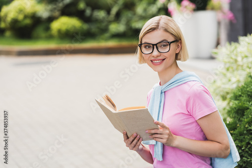Obraz premium young blonde student in glasses holding book outside