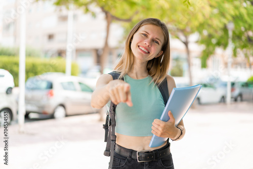 Fototapeta premium Young blonde student woman at outdoors points finger at you with a confident expression