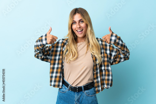 © luismolinero, Obraz premium Young blonde Uruguayan isolated on blue background giving a thumbs up gesture