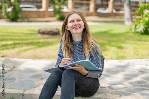 Obraz premium Young blonde woman at outdoors holding a notebook