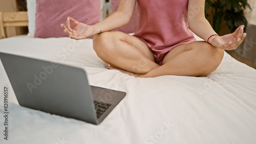 © Krakenimages.com, Naklejka premium Young blonde woman doing online yoga exercise sitting on bed at bedroom