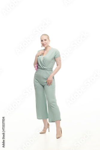 Fototapeta premium Young blonde woman in a mint knitted overalls on a white background.