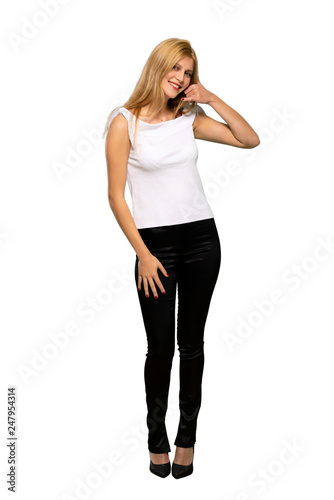 Fototapeta premium Young blonde woman making phone gesture. Call me back sign over isolated white background