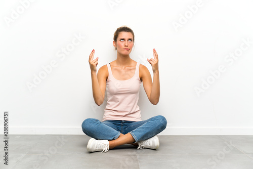 Fototapeta premium Young blonde woman sitting on the floor with fingers crossing