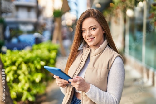 Obraz premium Young blonde woman smiling confident using touchpad at street