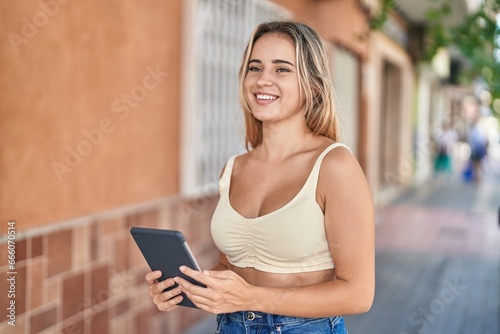 Obraz premium Young blonde woman smiling confident using touchpad at street