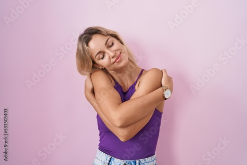 Obraz premium Young blonde woman standing over pink background hugging oneself happy and...