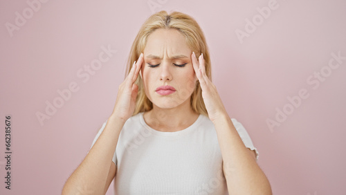 Fototapeta premium Young blonde woman suffering for headache over isolated pink background