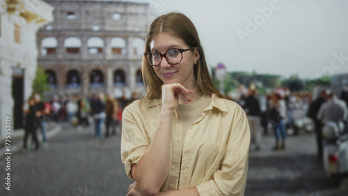 © Krakenimages.com, Fototapeta premium Young blonde woman wearing glasses in beige shirt touches chin with hand in street by coliseum; curiosity.
