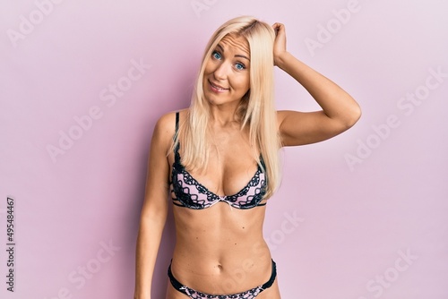 © Krakenimages.com, Fototapeta premium Young blonde woman wearing lingerie confuse and wonder about question. uncertain with doubt, thinking with hand on head. pensive concept.