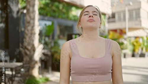 Fototapeta premium Young blonde woman wearing sportswear breathing at street
