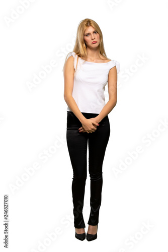 Fototapeta premium Young blonde woman with sad and depressed expression over isolated white background