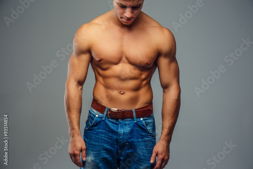 © Fxquadro, Fototapeta premium Young bodybuilder in denim jeans.
