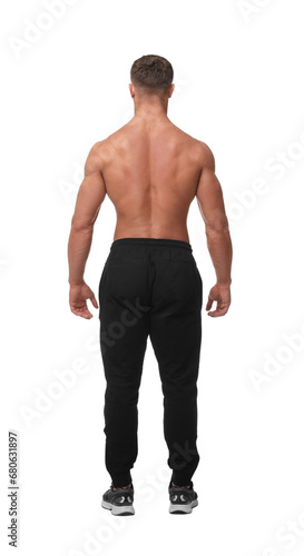 Fototapeta premium Young bodybuilder with muscular body on white background, back view