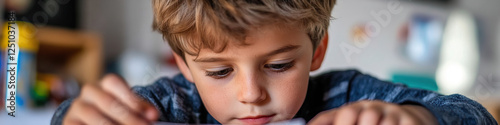 Fototapeta premium Young Boy Concentrating on Activity at Table