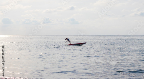 © Four_Lakes, Naklejka premium Young boy dives into the sea from the puddle board. Fun