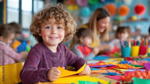 Fototapeta premium Young boy engaged in art activity with colorful paper and smiling happily in creative classroom setting
