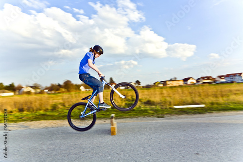 © travelview, Obraz premium young boy jumping with his dirk bike over a barrier at the stree