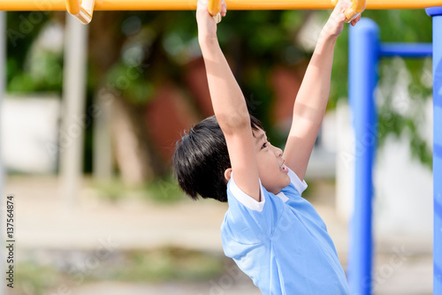 Fototapeta premium Young boy play with yellow bar