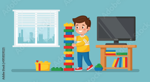 Fototapeta premium Young boy playing with blocks near television.