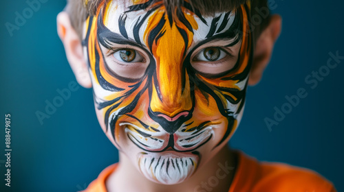 Fototapeta premium Young boy posing with a tiger face paint for carnival