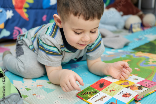 © Klarion, Fototapeta premium young boy reading a book with animal pictures