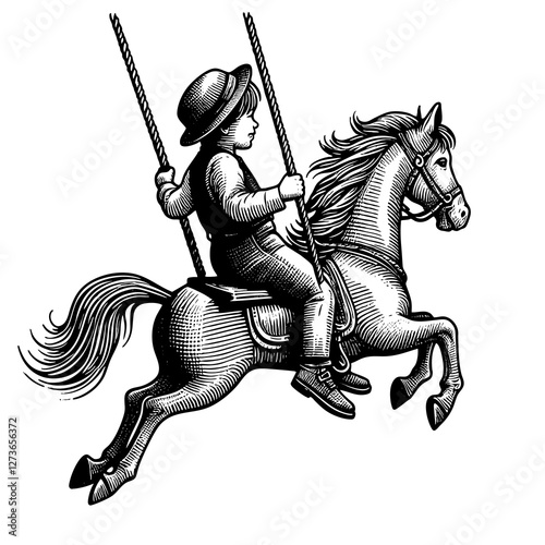 © toricheks, Obraz premium young boy riding a swinging horse, blending nostalgic childhood play with detailed etching in a classic artistic style engraving generative ai sketch PNG illustration