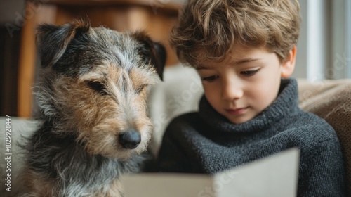 © CYBERPINK, Naklejka premium Young boy sitting on a couch with his dog. the boy is wearing a gray turtleneck sweater and has curly blonde hair. he is looking down at a laptop screen with a serious expression on his face.