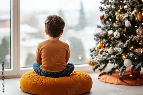 © oksa_studio, Obraz premium Young boy sitting on cushion, looking out window during winter. A decorated Christmas tree lights up the cozy room