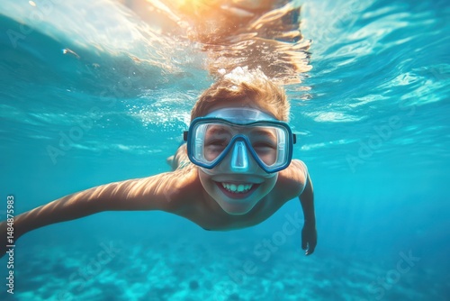 © Anna, Naklejka premium Young boy snorkeling underwater in bright sea