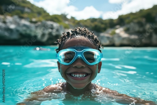 © Anna, Naklejka premium Young boy snorkeling underwater in bright sea
