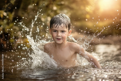 © YouraPechkin, Fototapeta premium Young boy splashes joyfully in a creek during a sunny summer afternoon