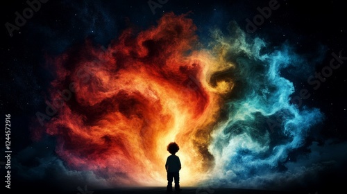 © Vertigo Images, Fototapeta premium Young boy stands before a swirling cosmic nebula of vibrant red and blue hues, a mesmerizing blend of fire and ice.