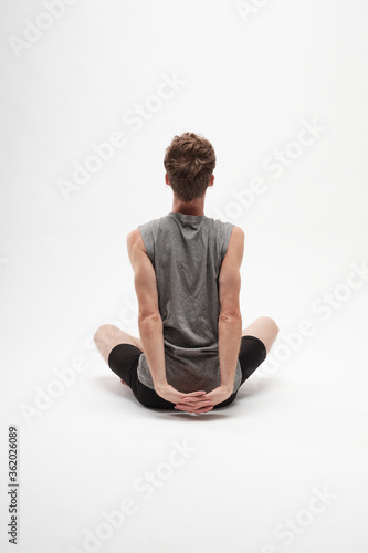 © Manuel, Fototapeta premium Young boy streching his arms with his legs crossed on white background
