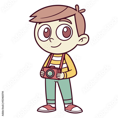 © Irina, Obraz premium Young boy with camera smiling in casual clothing illustration