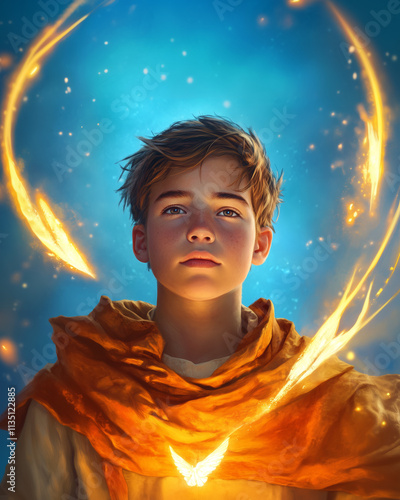 © ChaoticDesignStudio, Fototapeta premium Young boy with glowing aura in vibrant fantasy setting