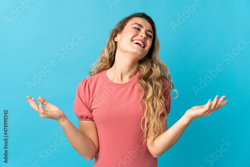 © luismolinero, Fototapeta premium Young Brazilian woman isolated on blue background smiling a lot