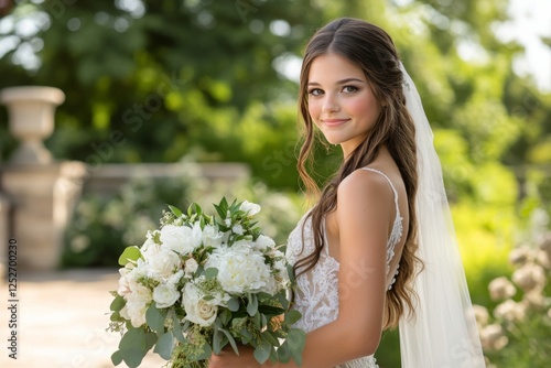 © olegganko, Fototapeta premium Young bride with bouquet outdoors in garden during daytime before wedding ceremony