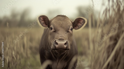 © musa, Fototapeta premium Young brown calf standing in tall grass, looking directly at camera.